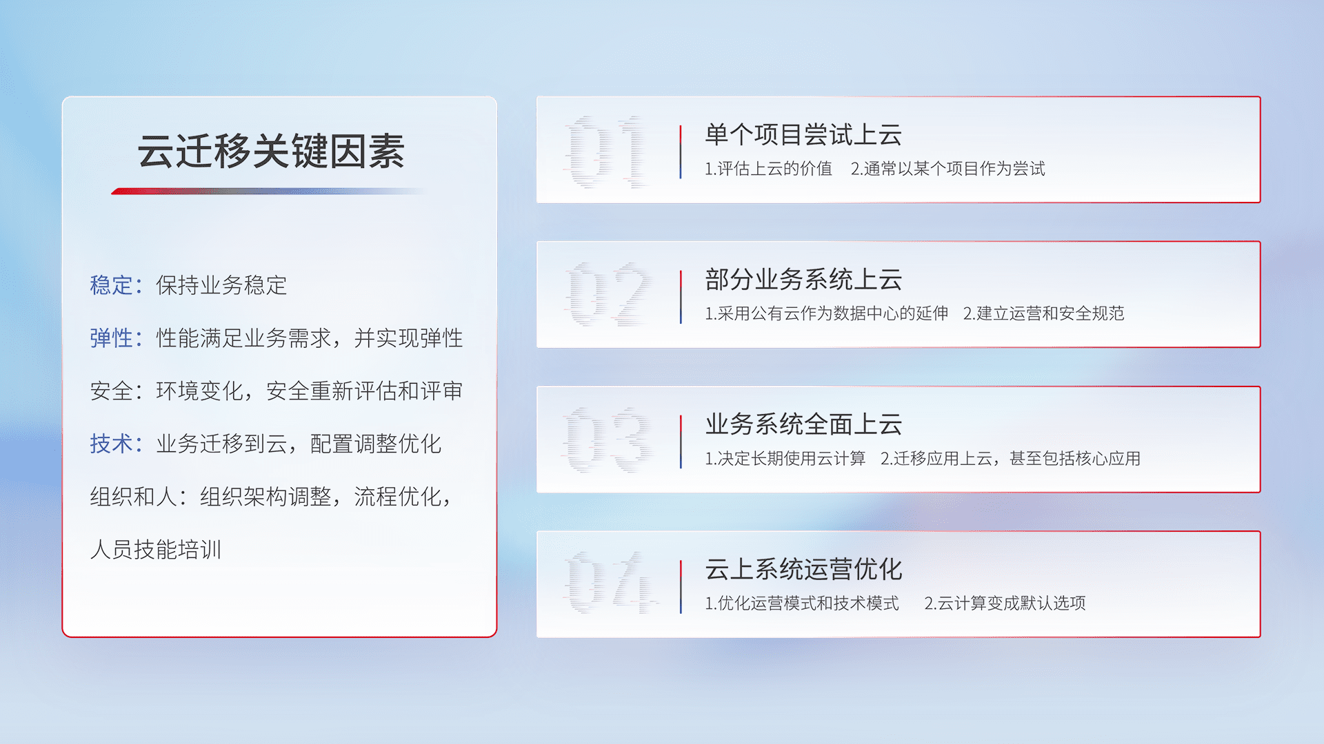 结合实际业务,,,,从规划设计、、、、云平台选型、、、、云原生改造、、数据迁移、、、集成交付,,,,迁移全过程为客户识别最佳上云路径,,做好风险识别管理,,,,设计网络架构、、、身份权限、、、、安全审计合规、、、操作审计、、、日志审计、、、、监控告警策略、、、多站点容灾设计等,,,对云上基础设施进行整体规划,,,,提升IT治理水平,,以满足弹性、、、、高可用、、、高性能的需求。。。。