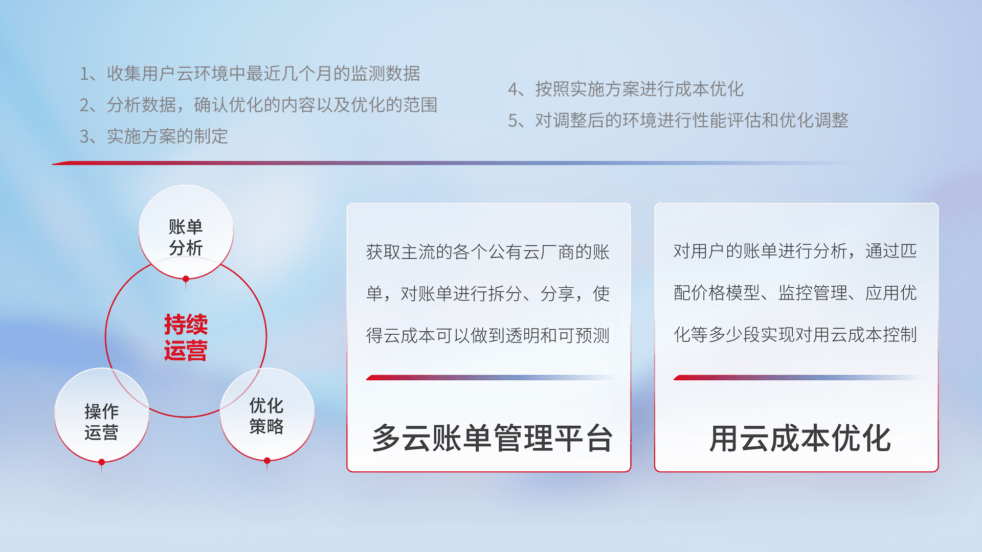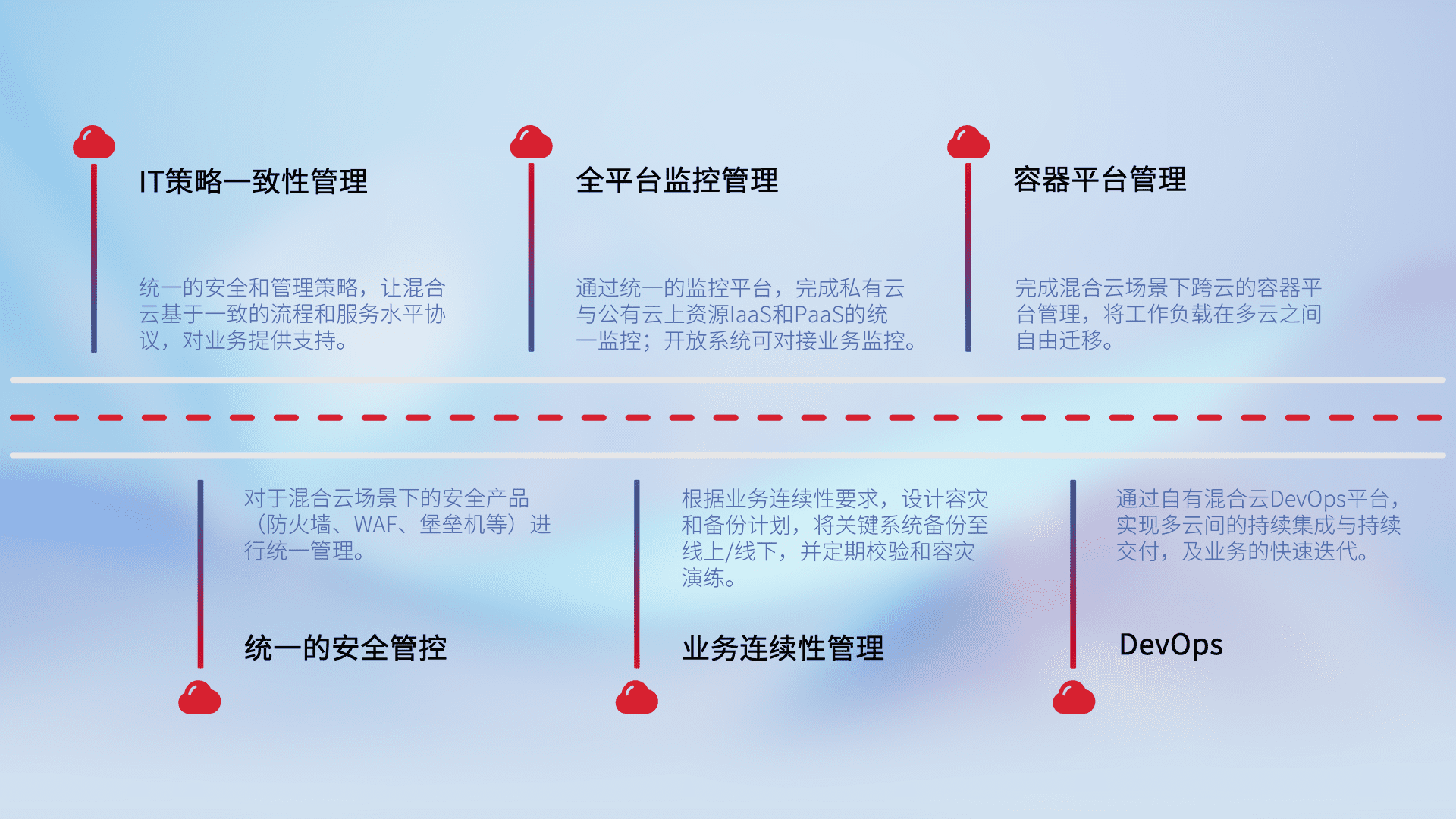 通过多云纳管,,以统一的资源数据模型把客户的云资源进行抽象和封装,,,进而实现对多云资源的统一操作,,,,保障云资源管理的可靠性、、、稳定性与可用性。。。量身定制化运维内容,,,配置、、开发运维、、补丁管理、、备份、、监控、、、、认证和访问管理、、、、审计和日常巡检等,,,,保障在用云过程中的可靠度,,,,稳定度以及高可用率。。